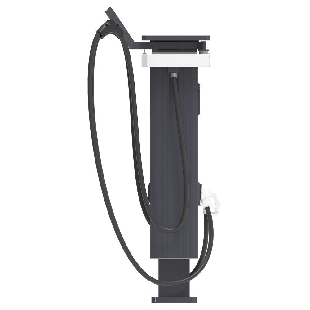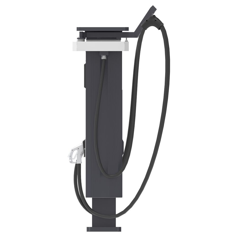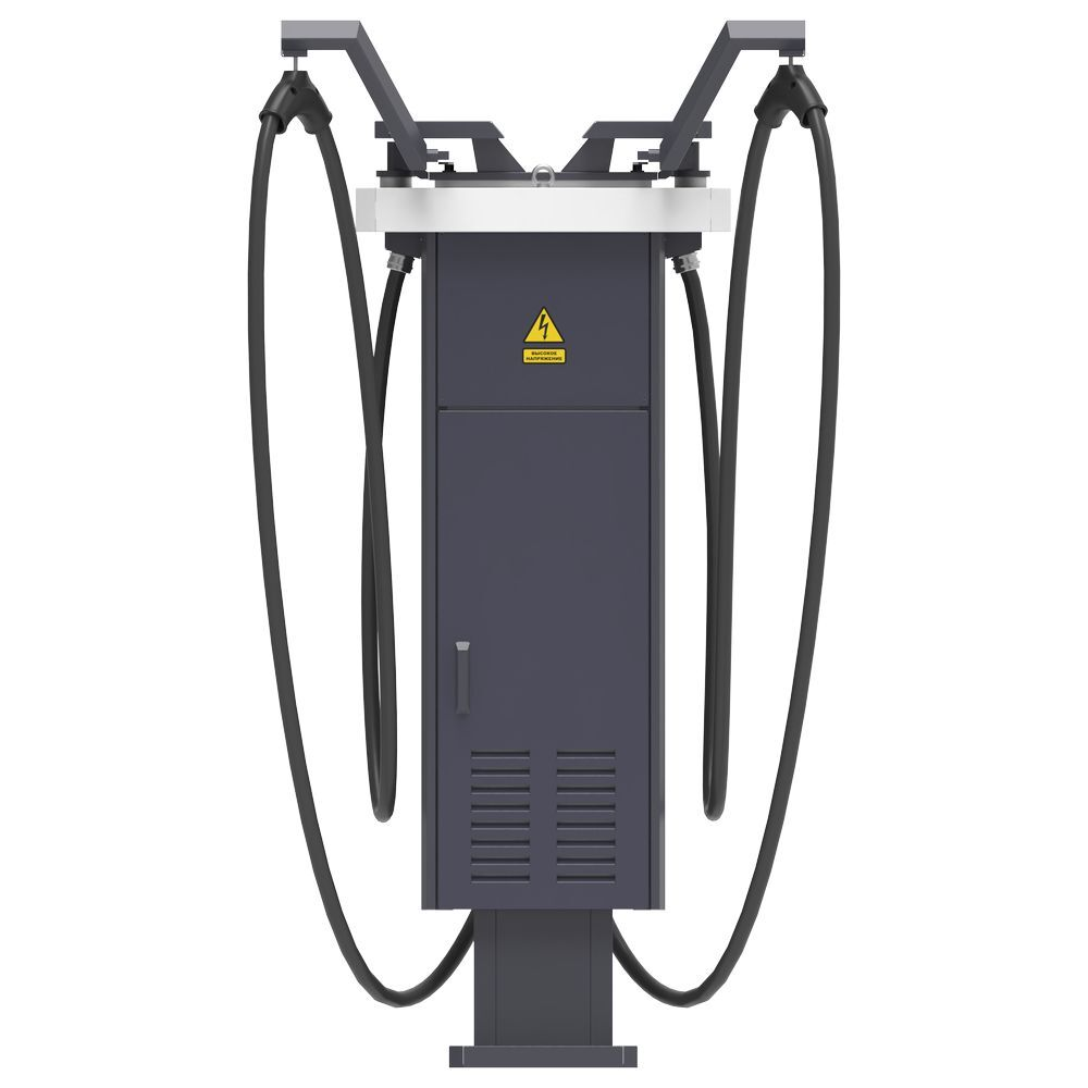 Укомплектована двумя зарядными пистолетами на выбор: CCS Combo2 или Tesla (NACS), + GB/T или CHAdeMO и розеткой Type2 22кВт.